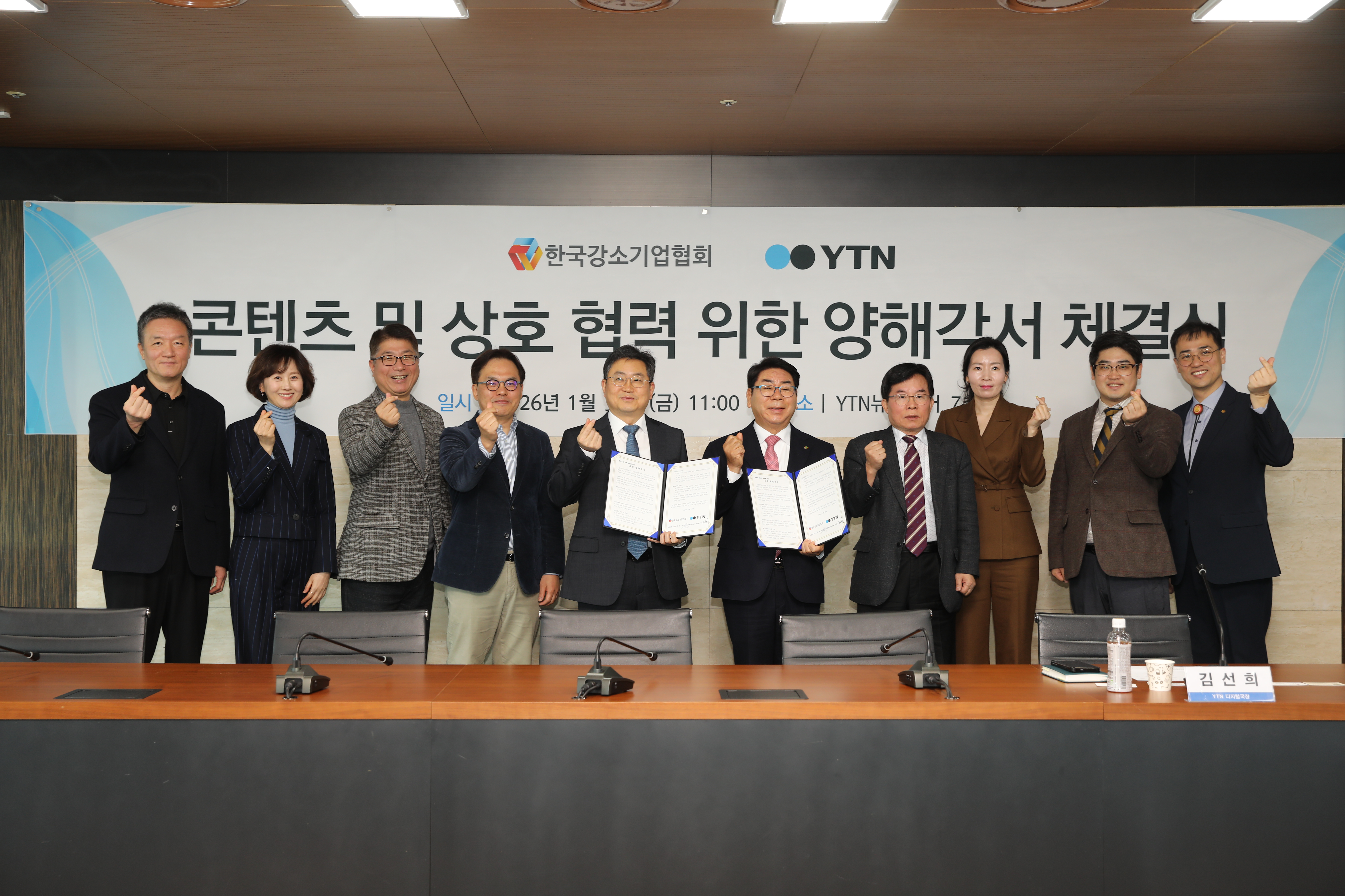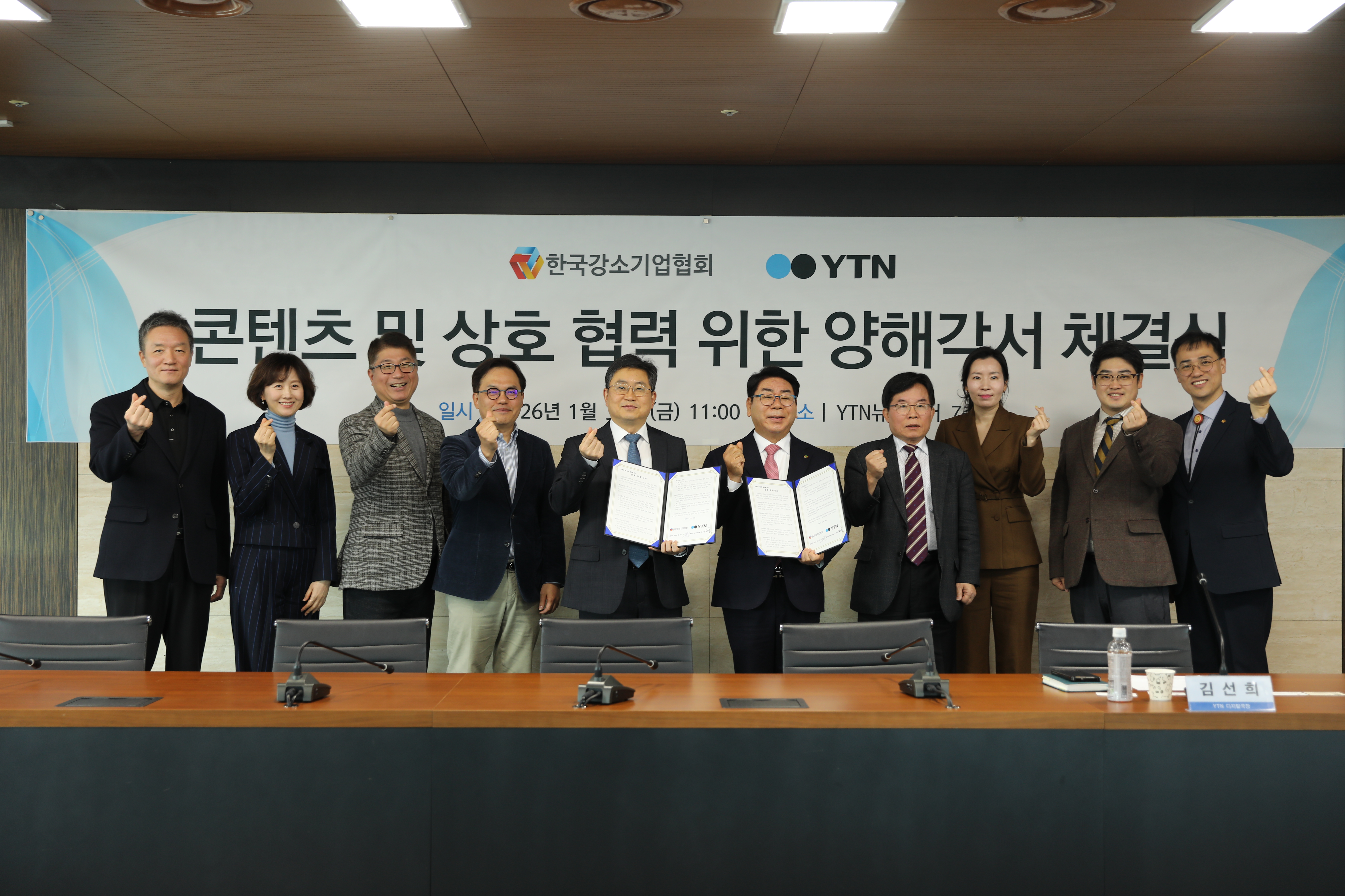 YTN과 한국강소기업협회(KSSBA)는 1월 30일(금) 오전 YTN 본사 대회의실에서 YTN 정재훈 대표이사 직무대행과 한국강소기업협회 김영식 회장 등 관계자가 참여한 가운데 우수 강소기업의 사례와 혁신 스토리의 확산을 위한 양해각서(MOU)를 체결했습니다.